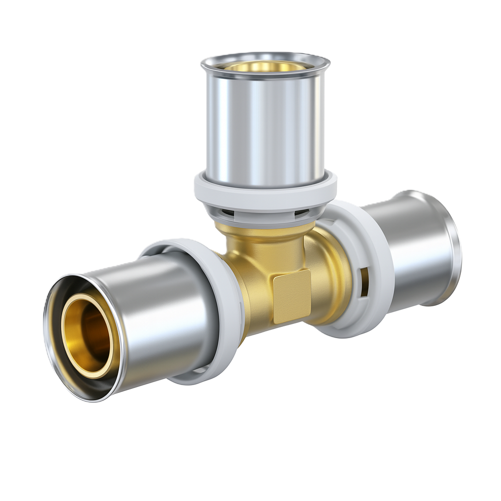 La tee de compresión con reducción para sistemas PEX-AL-PEX agua permite realizar derivaciones de distinto diámetro en forma rápida, segura y sin soldaduras. Su diseño optimizado en latón niquelado y anillos de acero inoxidable asegura una unión mecánica firme, resistente a la presión y libre de fugas.